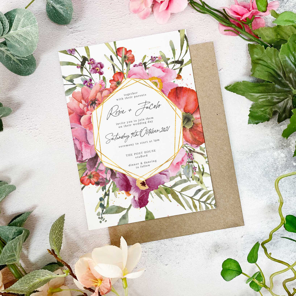 The blend of greenery, roses and brightly coloured flowers make our English Garden design really pop! This beautiful watercolour collection with the elegant gold geometric frames, highlighting your wedding details against the floral backdrop, represents the perfect way to let your friends and family know about your special day.