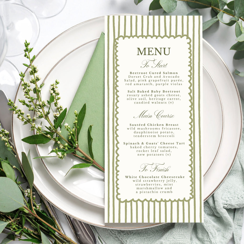 Make a timeless impression with our Elegant Green Stripes Wedding Invitation Set, perfect for couples seeking a modern yet classic aesthetic. Featuring a refined palette of sage green and ivory, this suite blends understated elegance with charming botanical details.