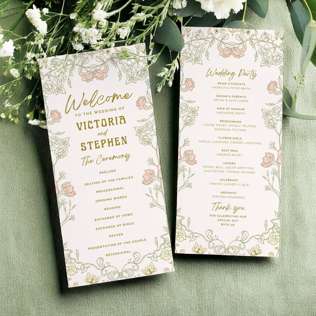 This wedding programme is DL size (99x210mm), is available as either single or double sided and printed on a luxury 320gsm textured card.