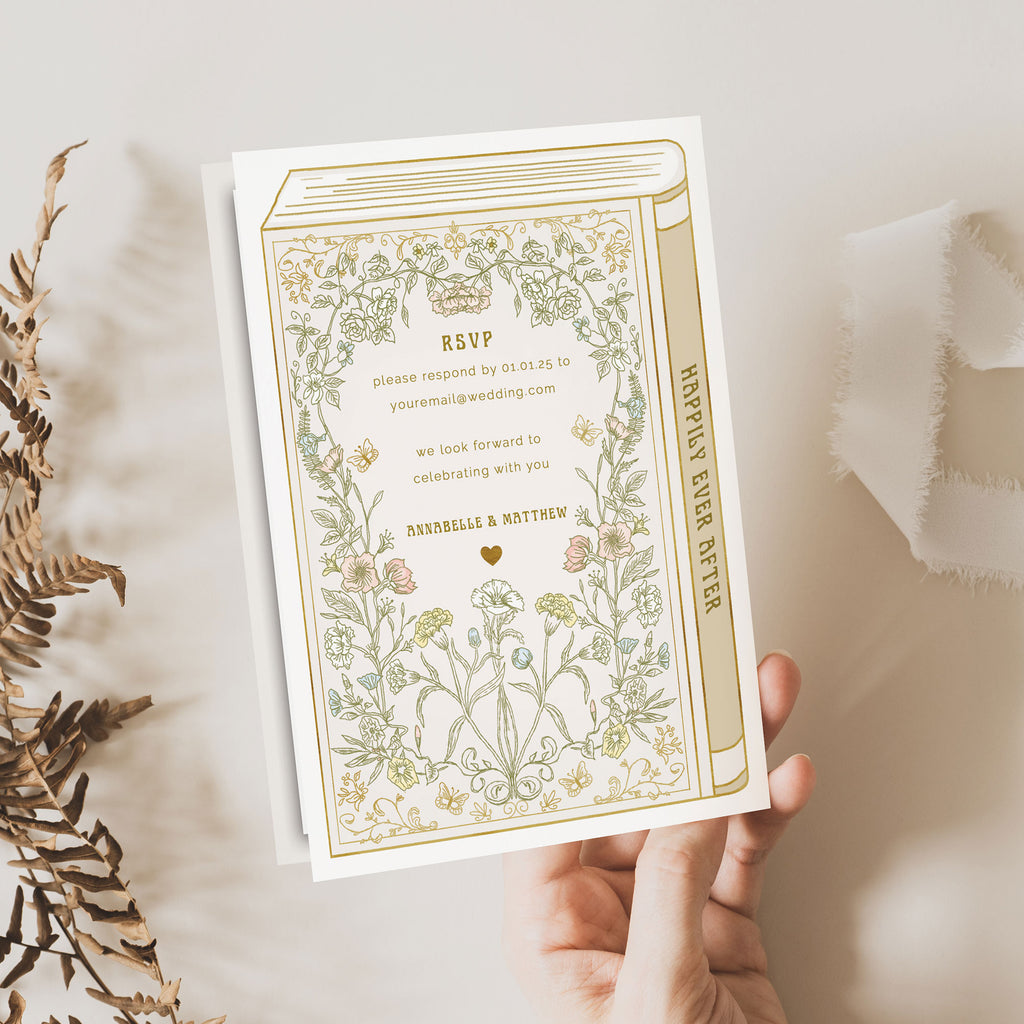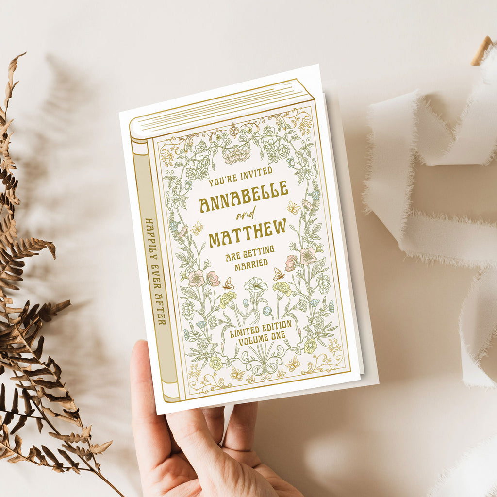 Delicate floral illustrations frame your names and wedding details on the “cover,” accented with elegant gold tones and soft pastel touches for a timeless aesthetic. The spine reads “Happily Ever After”, adding an enchanting detail that makes this invitation a keepsake in itself.