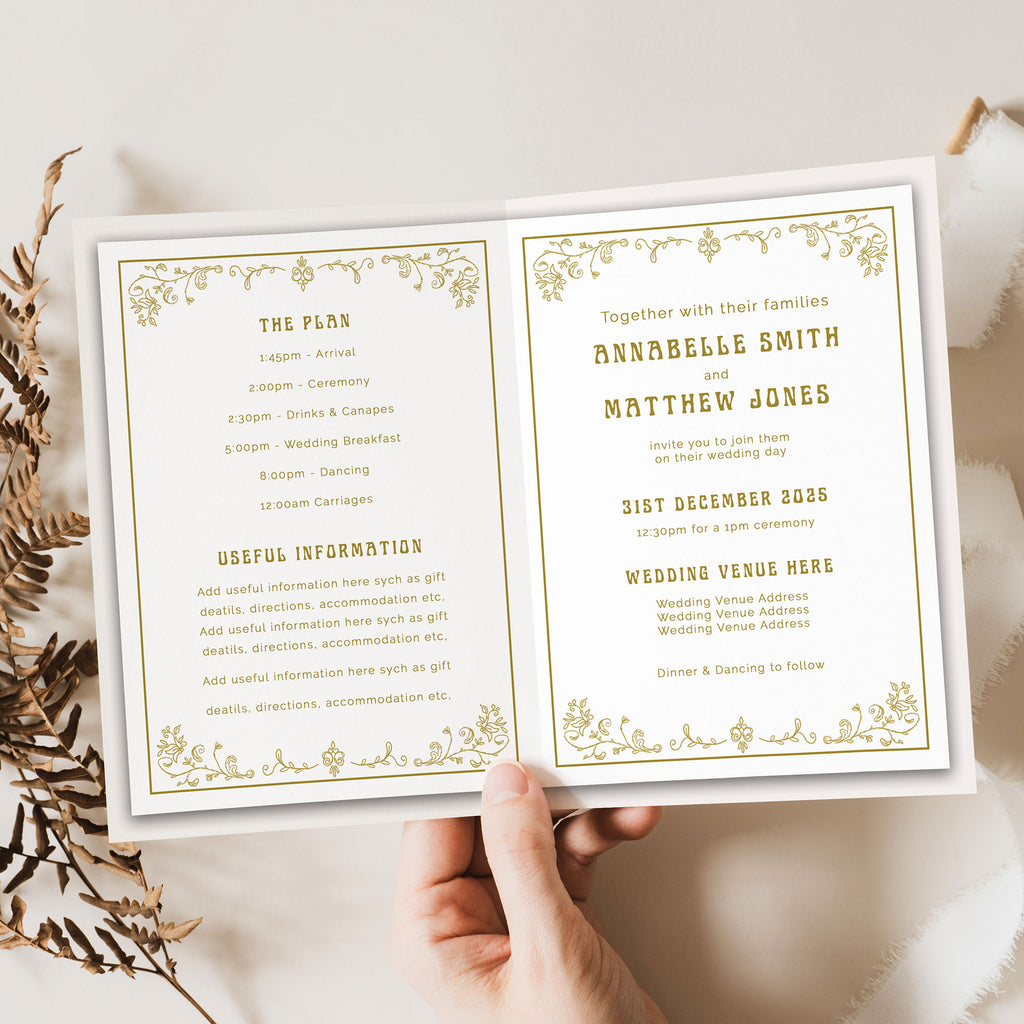 This folded invitation card design is 5x7" size (when folded), is printed on both sides a luxury 320gsm textured card, and comes complete with a 110gsm natural kraft envelope.