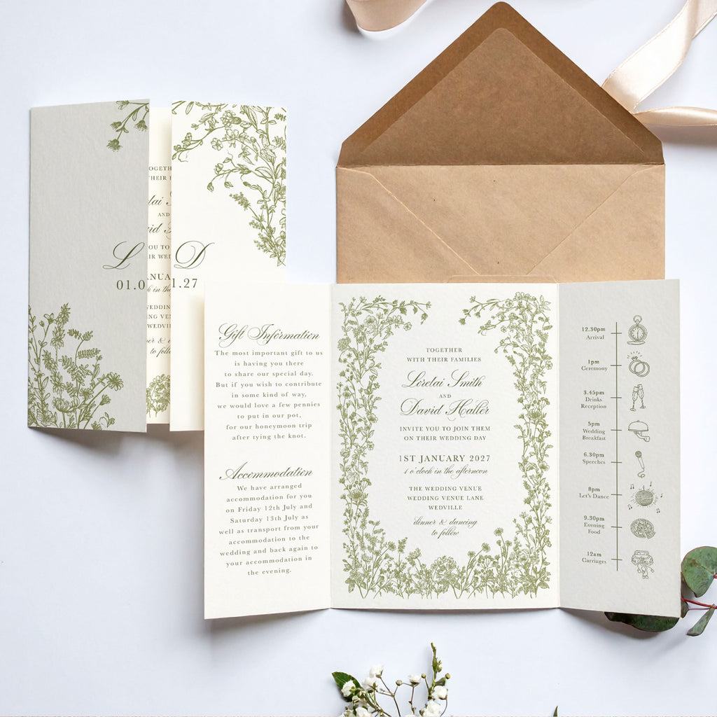wedding invitation with delicate green foliage and wildflowers in an arch surrounding the text.