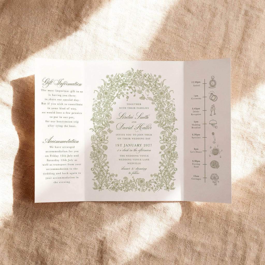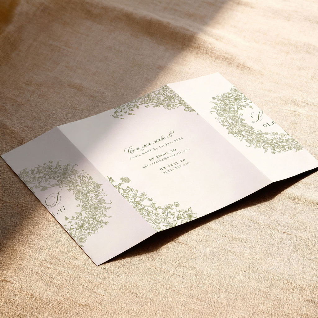 Rooted in elegance and rich with natural charm, the Classical Greenery Wedding Invitation Suite brings timeless botanical beauty to your celebration. Featuring detailed vintage-style floral illustrations in a soft sage green, this design evokes the serenity of lush garden landscapes and elegant countryside romance.