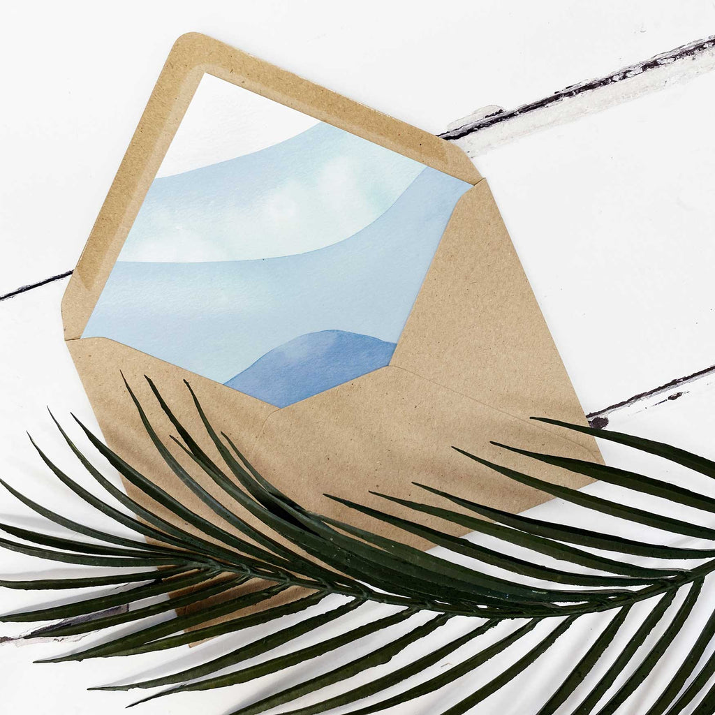 The exquisite watercolour design combined with the modern typography and calming blue tones offer the perfect way to inform your friends and family of your wedding by the sea.