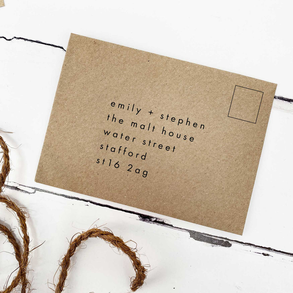 This RSVP card design is A6 size, can be printed on a choice of two luxury card options, and comes complete with a 100gsm natural kraft envelope.