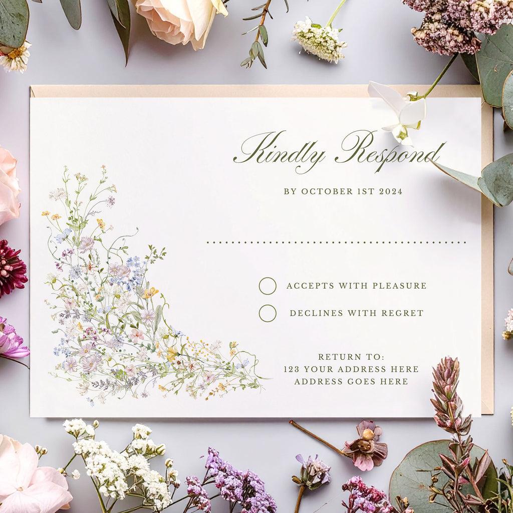 Delicate, romantic, and full of natural charm, the Wild Meadow Wedding Invitation Suite captures the whimsical beauty of a blooming countryside in spring. Framed with soft, watercolor wildflowers and trailing greenery, this suite is perfect for nature-loving couples planning a garden, outdoor, or rustic-chic celebration.